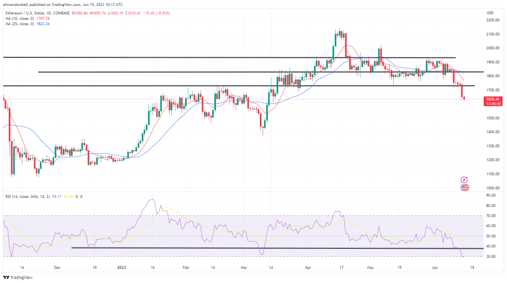 This is the lowest level that ethereum has fallen to since March 15, which is the last time price traded at a floor of $1,620.