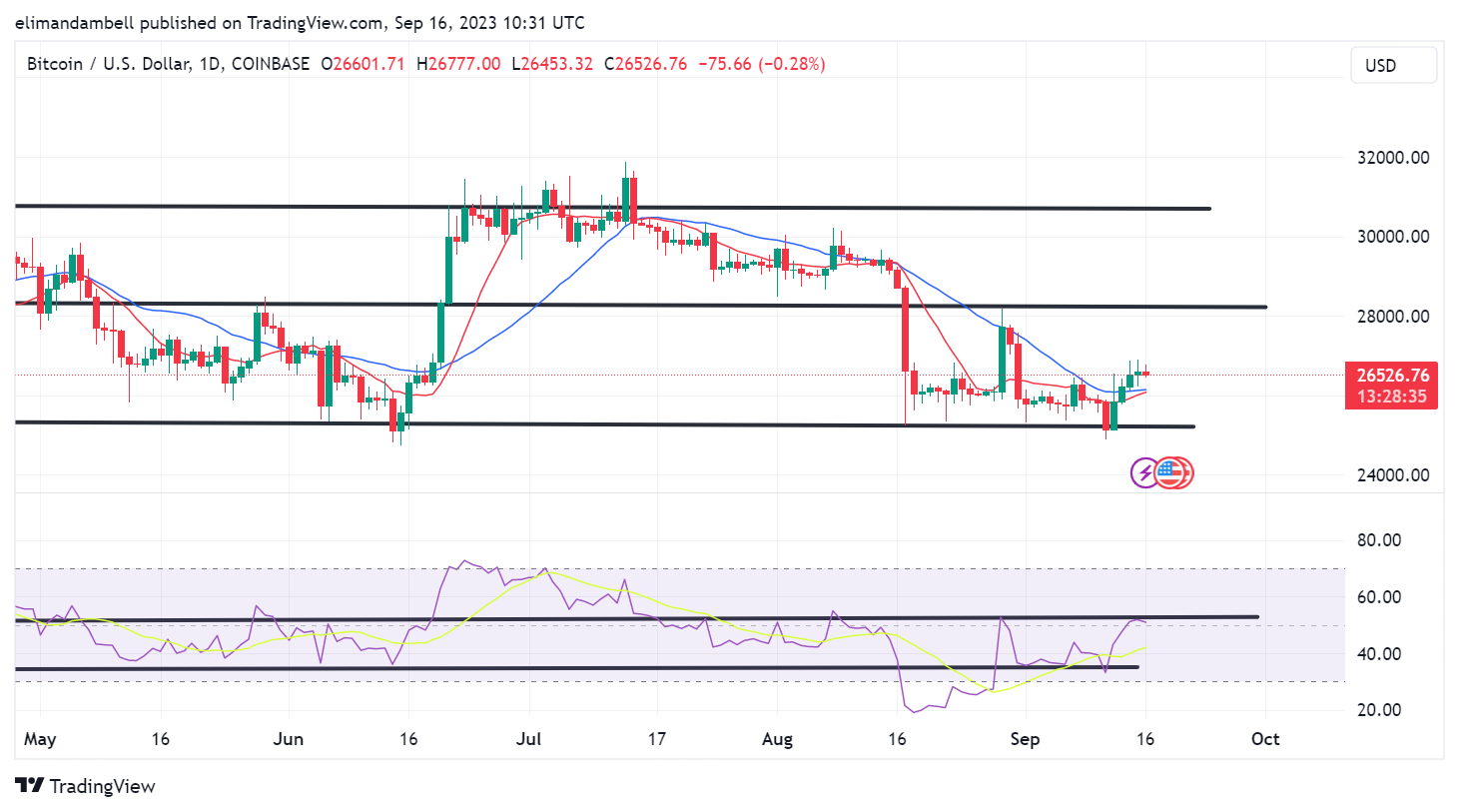 BTC/USD hit a bottom of $26,240.70 earlier in today’s session, which comes following a peak at $26,840.50 the day before.