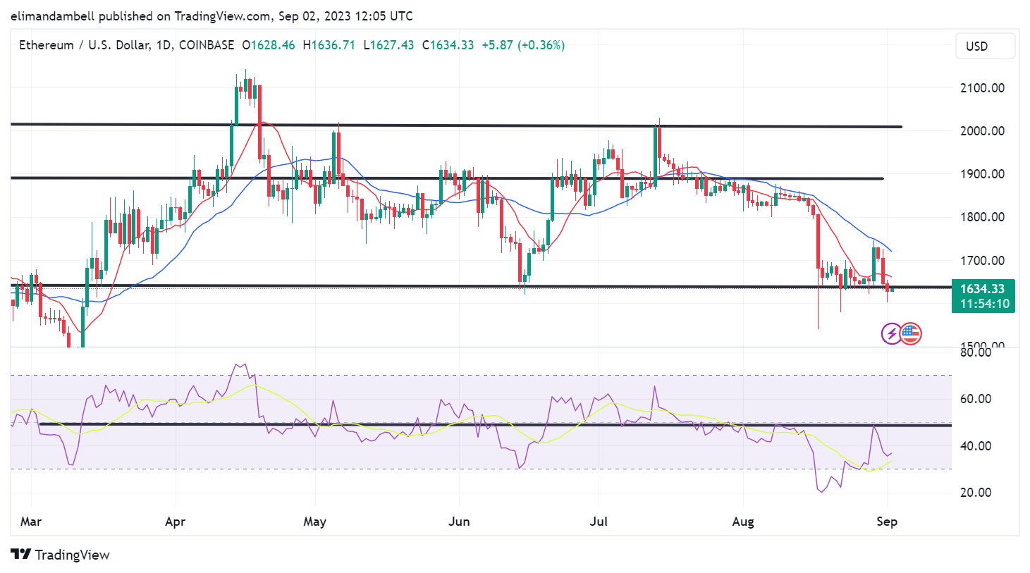 From the chart it appears that ETH managed to avoid dropping under $1,600 due to the relative strength index ( RSI) colliding with a floor at 36.00.