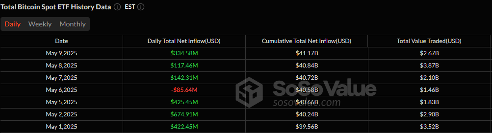 Momentum in the bitcoin ETF market remained unshaken on the last day of the trading week, with Friday, May 9, marking another powerful session of inflows. The inflows totaled $334.58 million, with the day’s net gain underscoring continued institutional confidence.