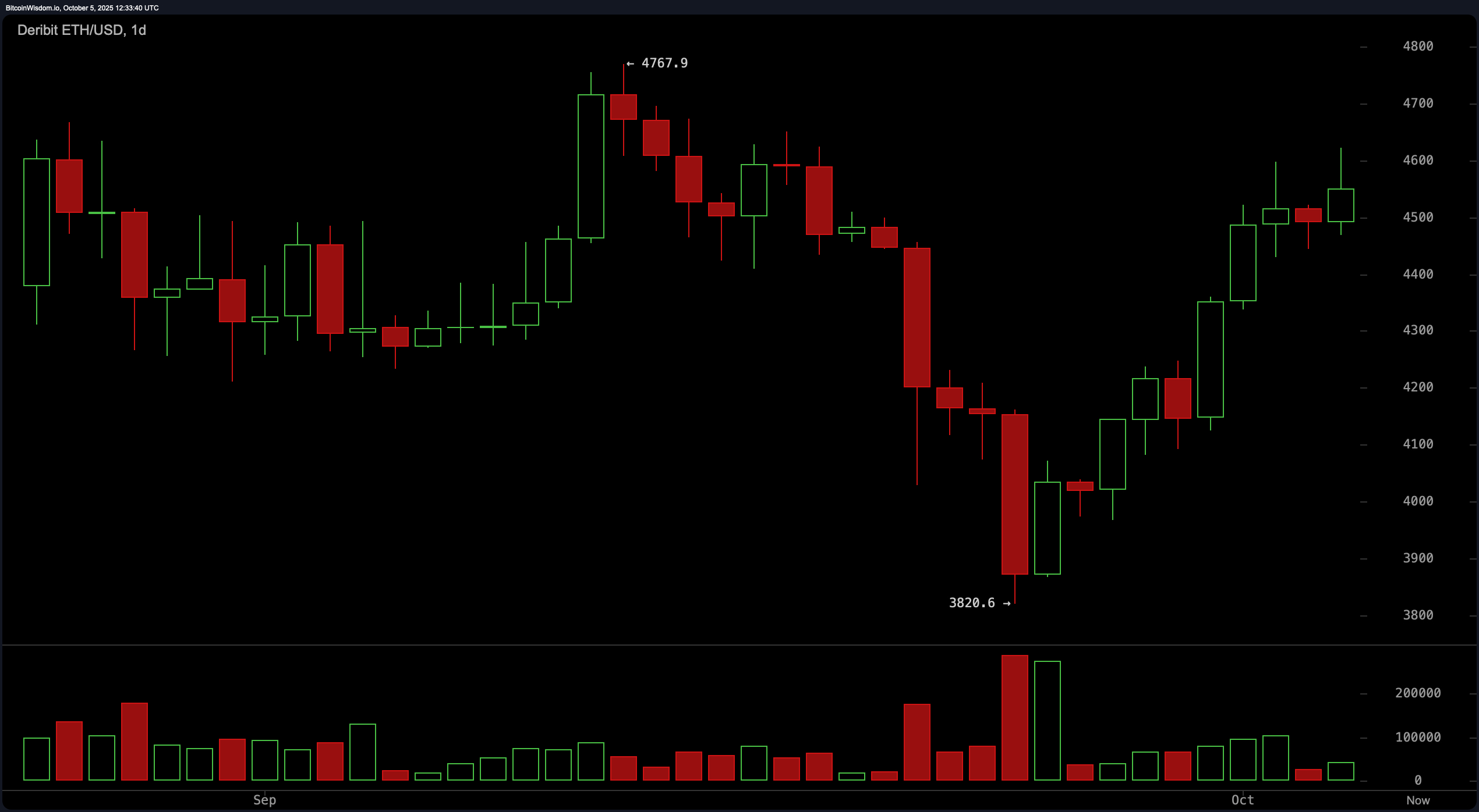 দৈনিক চার্টটি একটি পুনরুদ্ধার মাস্টারপিস তৈরি করছে। প্রাথমিক এক পতনে যা দামের $4,768 থেকে নিম্নগামী $3,820 পর্যন্ত নিয়ে যায়, ইথেরিয়াম ক্যাফেইনেটেড ক্যাঙ্গারুর মতো ফিরে আসে। একাধিক সবুজ দৈনিক ক্যান্ডেলস্টিকগুলি প্রবেশ করেছে, উচ্চতর উচ্চ এবং উচ্চতর নিম্ন সেট করছে, যখন আপ ডে-গুলিতে বৃদ্ধি ভলিউম ইঙ্গিত দেয় যে এটি হোপিয়ামেই সীমাবদ্ধ নয়—এটি ব্যাপক আশা নয়।