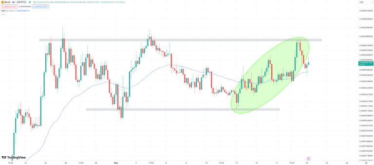 BONK has passed its 50-day exponential moving average (EMA) on the 4-hour time frame, using the level as support earlier today.