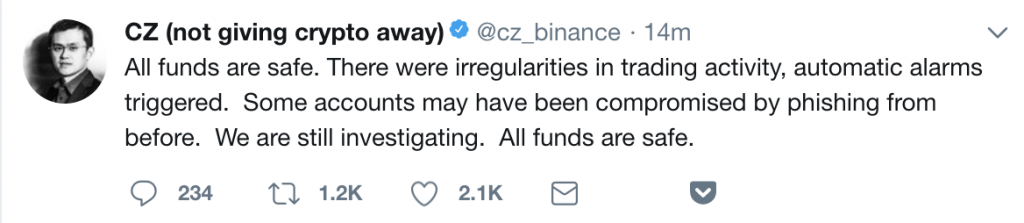 Some of the affected users are adamant that they have never used the Binance API, but the exchange’s CEO attributed this to previous phishing attacks. More sophisticated than a conventional phishing attack, this instance would steal a user’s login details via a virtually indistinguishable URL then redirect them to the real Binance site. The attacker would have been none the wiser that their account had been compromised until today.