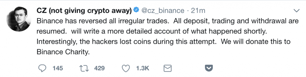 On the plus side, there’s a happy ending to this story, as Binance CEO Changpeng Zhao explains:
