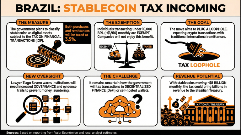 The measure, described last week, would be submitted by Brazil’s Revenue Service for public consultation and would impose a 3.5% tax on both stablecoin purchases and remittances, treating them as foreign currency exchanges subject to the existing Tax on Financial Transactions (IOF).