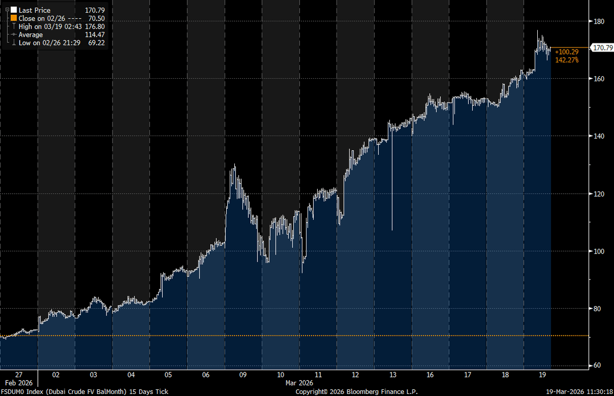 Cash Dubai crude crossed $170 per barrel for the first time in history this week, delivering a clear signal that the physical oil market is under severe strain amid escalating Middle East disruptions.