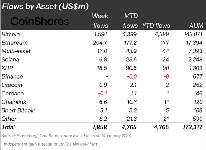 Coinshares: Digital Assets See $1.9 Billion Inflow as Investors Respond to Trump’s Executive Orders