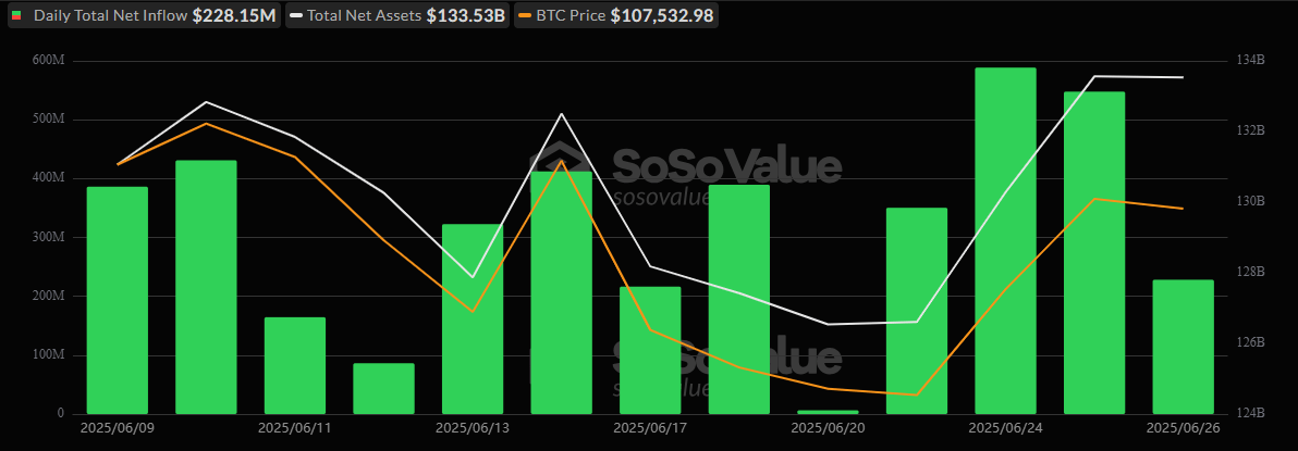 Bitcoin exchange-traded funds (ETFs) notched their 13th straight day of inflows with $228 million in fresh capital, led by Blackrock’s IBIT. Meanwhile, ether ETFs stumbled into the red, posting a $26.46 million net outflow.