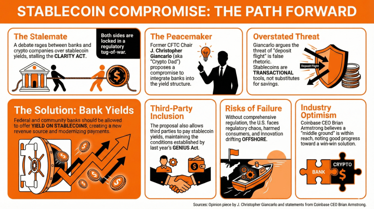 Christopher Giancarlo, bývalý šéf CFTC, navrhuje, aby banky integrovaly a nabízely zákazníkům výnos ze vkladů ve stablecoinech, čímž by se předešlo nerovnováhám, které znepokojují bankovní establishment. Podle něj by tento kompromis umožnil posunout zákon Clarity Act kupředu, s přínosy jak pro banky, tak pro kryptoburzy.