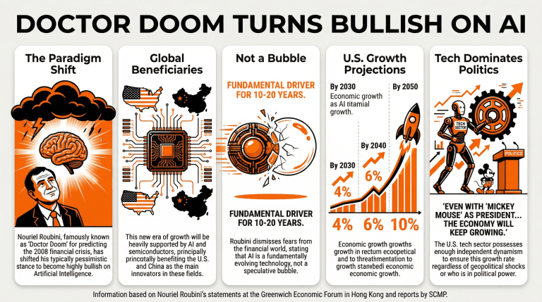 Nouriel Roubini, známý také jako „Doctor Doom“ díky své přesné předpovědi finanční krize z roku 2008, nyní zaujímá optimistický postoj a očekává oživení světové ekonomiky v souvislosti s rozvojem technologií a umělé inteligence (AI), v čele s Čínou a USA.