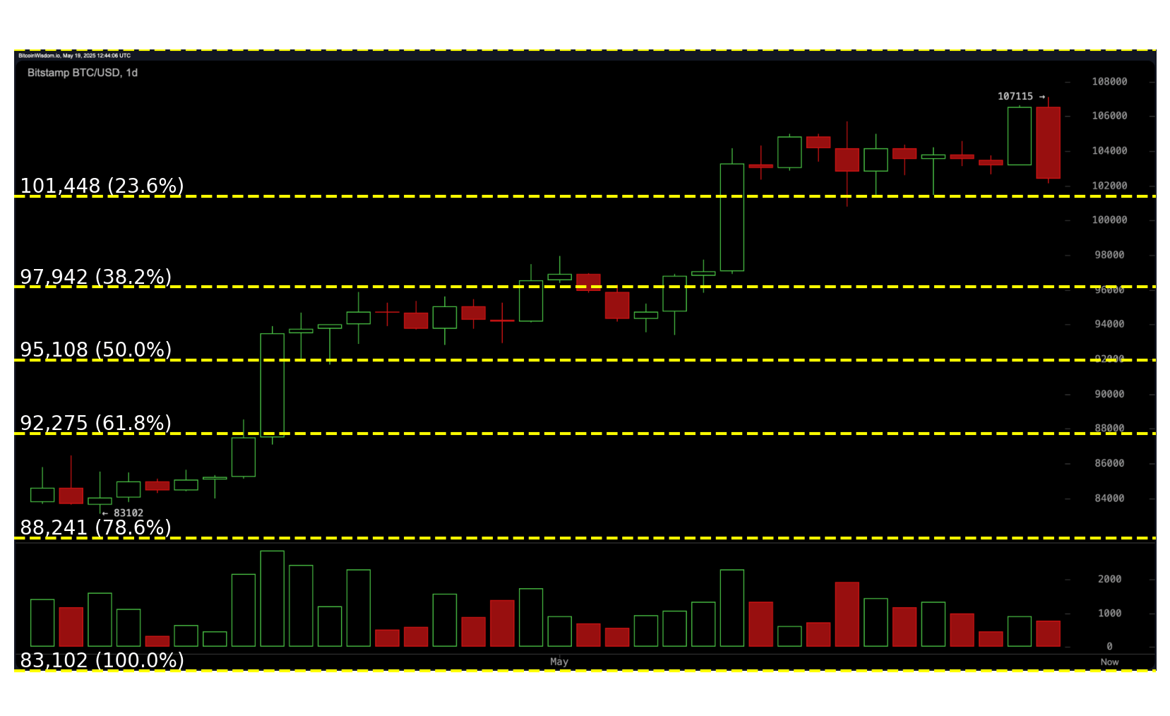 Například, pokud bitcoin stoupne z $90,000 na $100,000, vrátí se na $95,000 a obnoví svůj vzestupný trend, 161.8% prodloužení může být projektováno kolem $106,180 jako potenciální cíl. Tato prodloužení pomáhají obchodníkům definovat výstupní body a řídit obchody, jelikož se trendy vyvíjejí.