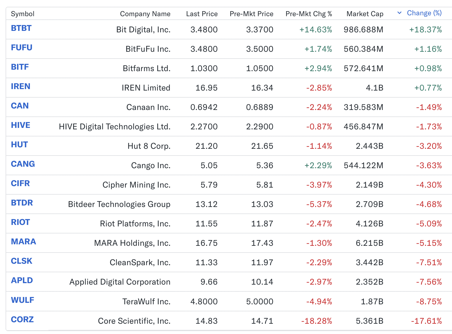 Bit Digital-aktier (Nasdaq: BTBT) steg 18,4% mandag og gjorde det til den bedst præsterende blandt dens krypto mining kolleger, hvor mange handlede markant lavere. De fleste større mining-aktier, inklusive Cleanspark, Marathon, Riot og Core Scientific, oplevede fald på mellem 5% og 17% den dag, hvilket understreger en skarp divergens i stemningen.