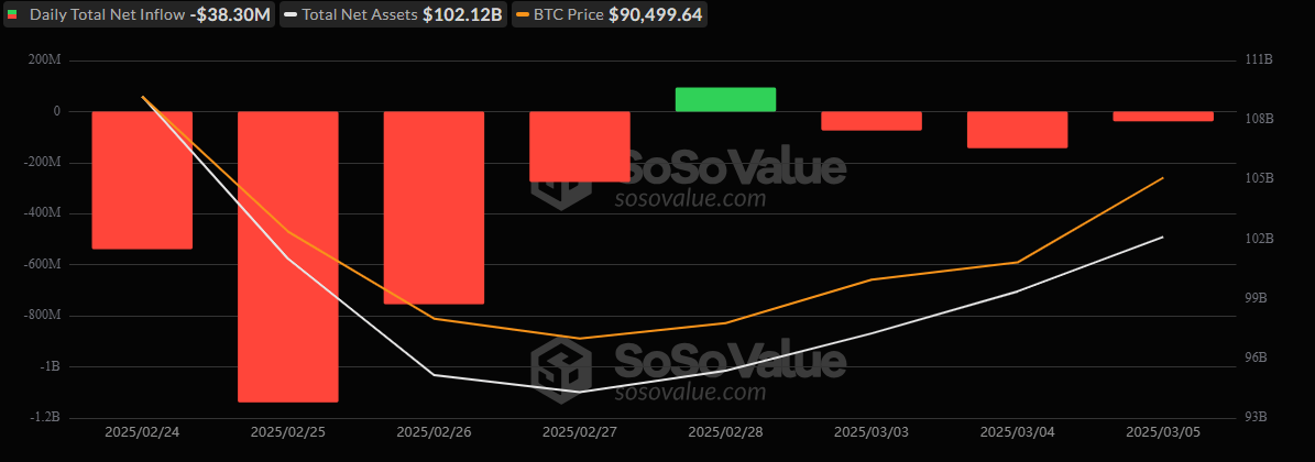 I en uge præget af betydelige markedsudsving oplevede bitcoin og ether exchange-traded funds (ETF’er) bemærkelsesværdige udstrømme onsdag den 5. marts, ifølge data fra Sosovalue. Bitcoin ETF’er så nettoudstrømme på i alt 38,30 millioner dollars, mens ether ETF’er stod over for mere betydelige nettoudstrømme på 63,32 millioner dollars.