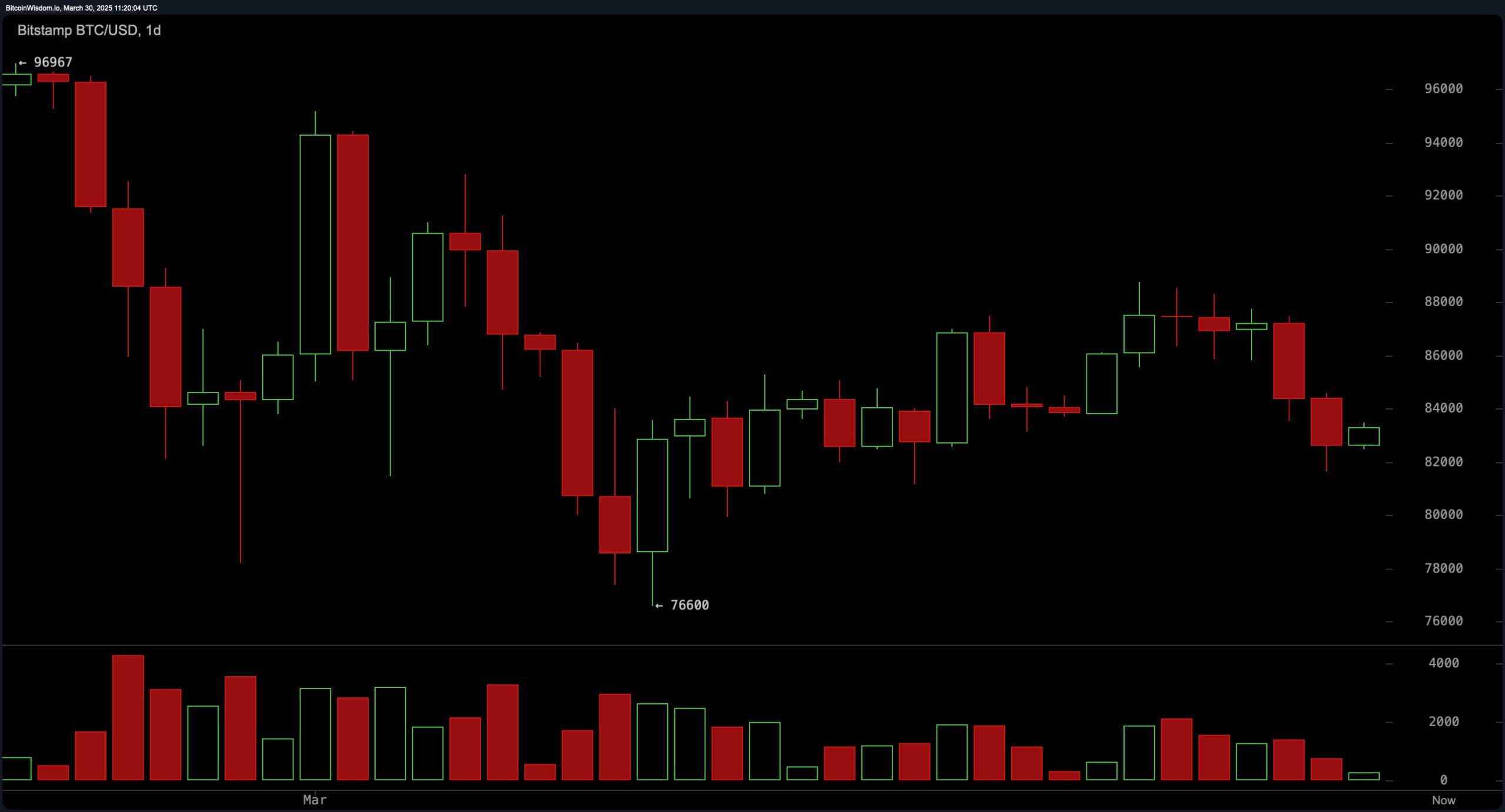 På den daglige graf forbliver bitcoin i en defineret nedadgående trend, efter at være faldet fra sin seneste høj på $96.967. En klynge af røde lys med udvidede væger antyder vedvarende salgspres, men lejlighedsvise grønne lys indikerer en gang imellem købsstøtte. Den nærmeste støtte ved $82.000 testes i øjeblikket, med yderligere downside potentiale, hvis dette niveau bryder. Modstandsniveauer mellem $88.000 og $90.000 udgør yderligere udfordringer for bullish momentum. En vedvarende bevægelse over disse zoner, understøttet af øget volumen, kunne signalere en trendvending.