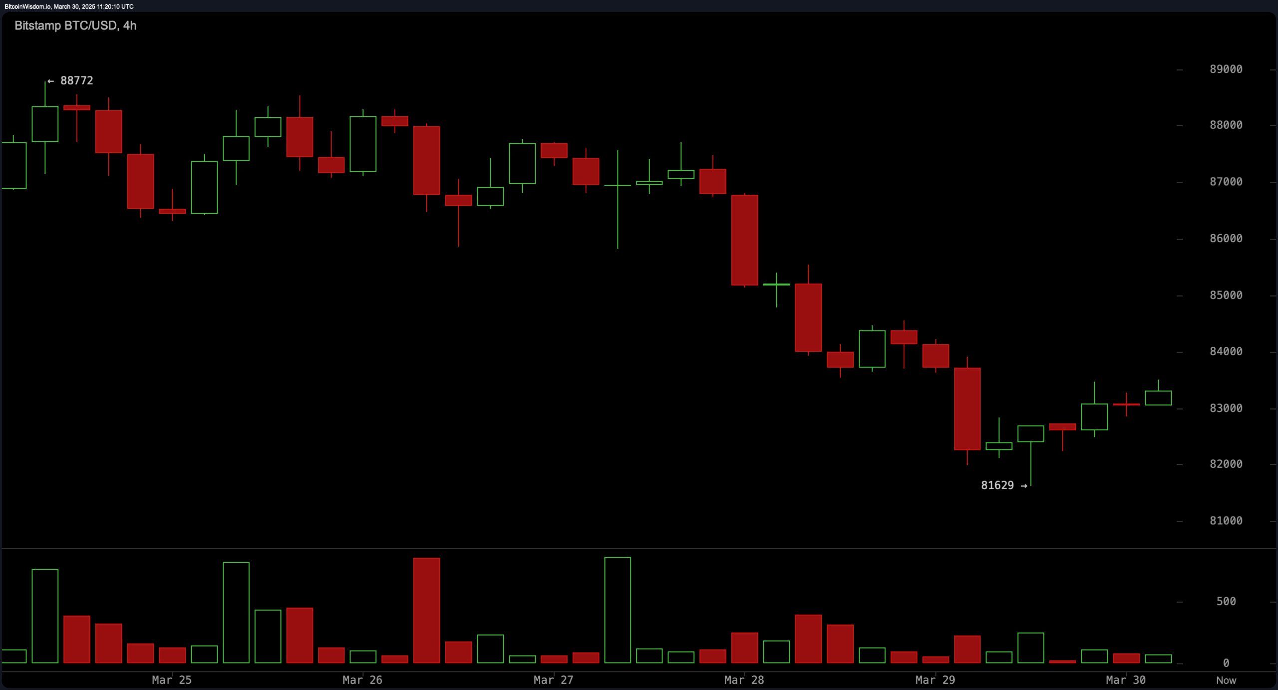 4-timers grafen giver et tydeligere billede af den nylige lettelsesstigning fra $81.629 lav. Mens mindre volumenstigninger under salgshændelser fremhæver markedsusikkerhed, underminerer fraværet af stærk købsvolumen rettidigheden af rebounden. Et betydeligt modstandsområde mellem $83.500 og $84.000 forbliver afgørende. En undladelse af at bryde denne zone ville antyde fortsat pres nedad, mens et gennembrud, ledsaget af en volumenstigning, kunne tilbyde en købslejlighed. Handlende bør overvåge mønstre af afvisning eller bullish bekræftelse på disse niveauer.