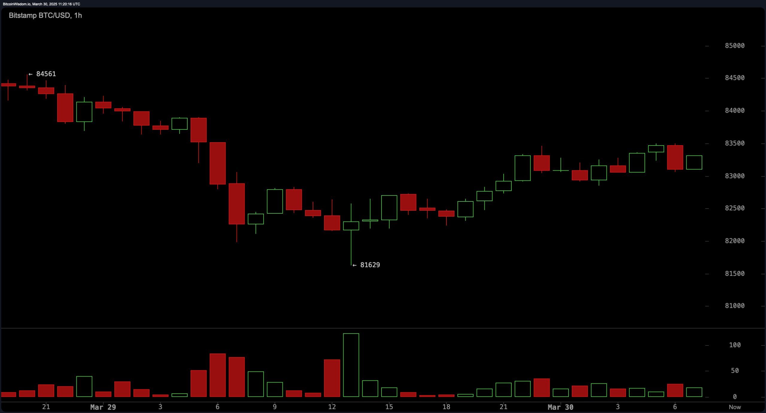 På 1-times grafen har bitcoin vist tegn på kortvarig konsolidering efter en stigning fra sin seneste lavpunkt på $81.629. På trods af midlertidigt opadgående momentum indikerer lavere toppe og lavere bundpunkter en vedvarende bredere nedtrend. Modstand ved $84.500 forbliver et nøglepunkt, mens støtte ved $81.600 er afgørende. Volumenmønstre antyder svag køberdeltagelse, med grønne søjler der mangler overbevisning. Et gennembrud over $83.500 med øget volumen kunne indikere en kortvarig position i en bullish retning, hvorimod et afvis ved dette niveau ville styrke bearish stemningen.