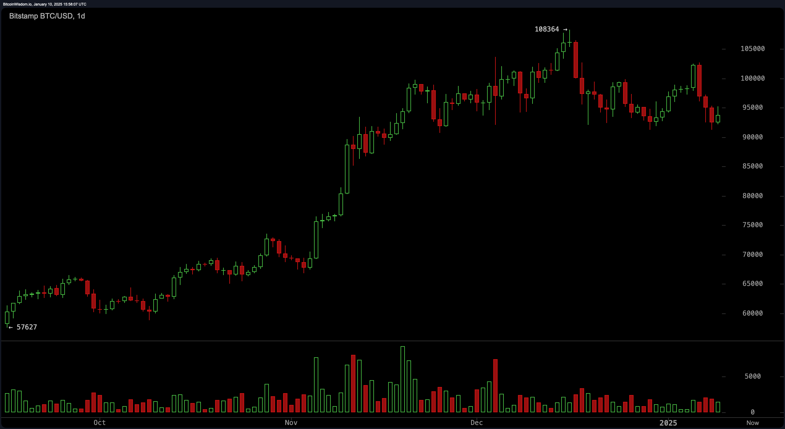 Det daglige diagram illustrerer bitcoin konsolidere sig nær sit støttebånd på $91.000 til $93.000 efter et skarpt tilbagefald fra sin seneste højeste på $108.364. Forhøjede volumener observeret ved toppen antyder en distribution fase, mens den efterfølgende stagnation indikerer en aftagende bullish styrke. Kortsigtede glidende gennemsnit—10-dages og 20-dages eksponentielle (EMA) og simple glidende gennemsnit (SMA)—indikerer bearish tendenser, hvilket lægger pres nedad. Dog er 100-dages og 200-dages glidende gennemsnit stadig i overensstemmelse med en bredere bullish fortælling, hvilket tyder på modstandsdygtighed i bitcoins overordnede bane.