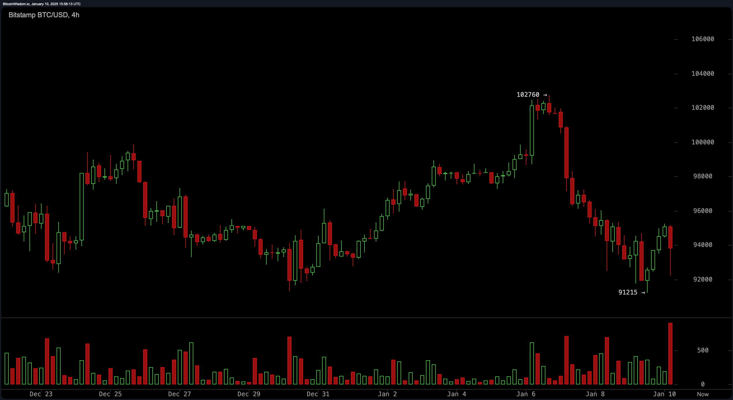 Firetimers diagrammet afslører tegn på et korrigerende rebound efter faldet til $91.215. Dog kaster svag handelsvolumen under denne genopretning tvivl om dens holdbarhed. Modstandsniveauer mellem $95.000 og $96.000 stemmer overens med lavere højder dannet efter tilbagetrækningen fra $102,760, hvilket ekkoer den vedvarende bearish sindsstemning. Et afgørende brud over $96.000, understøttet af forhøjet volumen, kunne ændre udsigterne, hvilket gør $102.760 til det næste centrale mål.