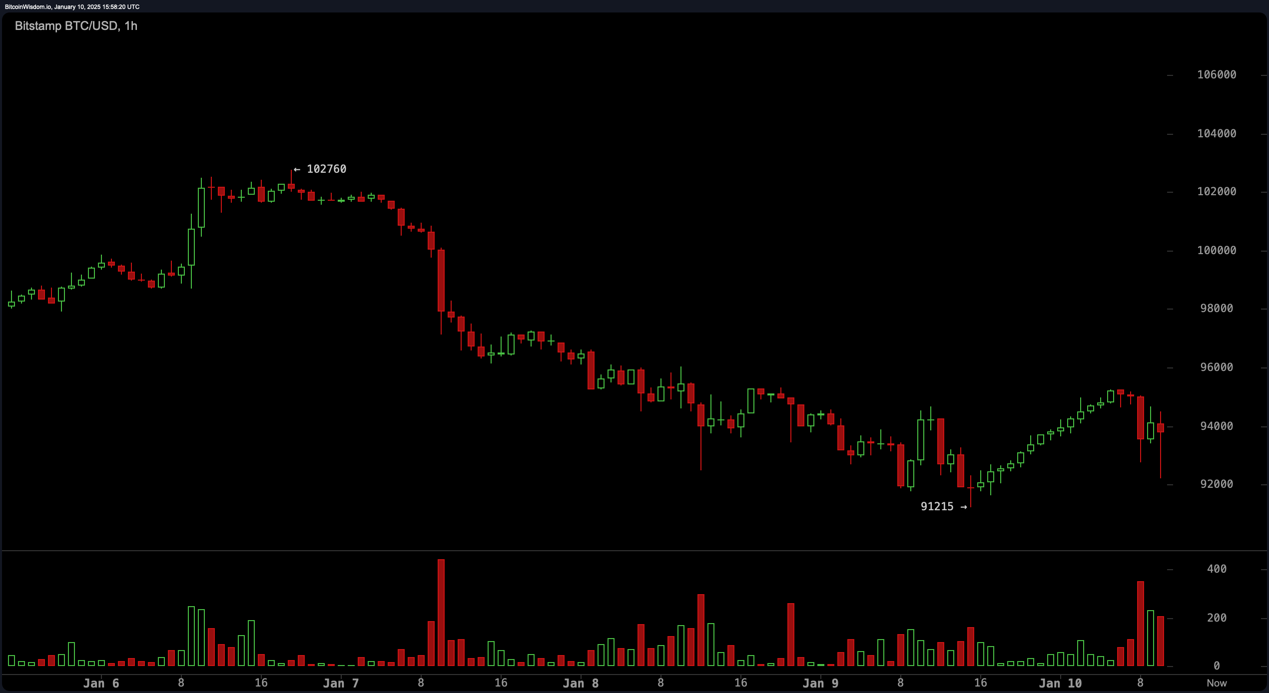 På en timebasis intensiveres bitcoins volatilitet, da den stræber efter at komme sig fra nylige lavpunkter. Modstanden stivner nær $95,000, mens støtten holder sig stabil i området $91,000 til $92,000. Momentumindikatorer som relative strength index (RSI) og stochastic oscillator forbliver neutrale, mens det glidende gennemsnit konvergensdivergens (MACD) antyder bearish forhold. Ikke desto mindre antyder en beskeden stigning i positivt momentum på kortere tidsrammer potentielle købemuligheder.