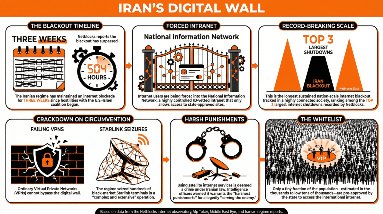 - Hvorfor oplever Iran i øjeblikket en massiv internetnedbrud? Regimet har tvunget brugerne over på et statskontrolleret intranet i over tre uger midt i de igangværende fjendtligheder med den amerikansk-israelske koalition.