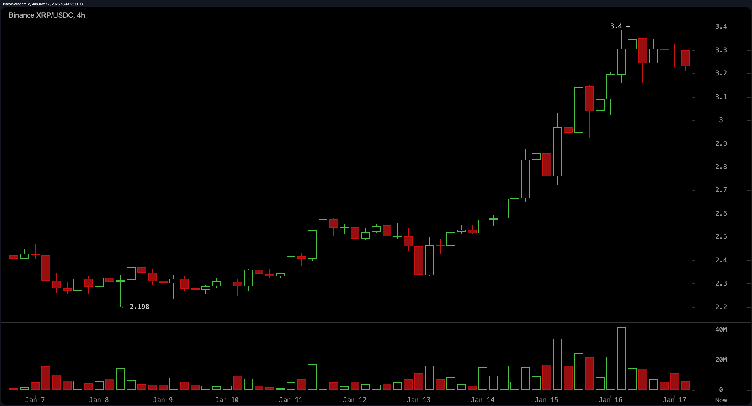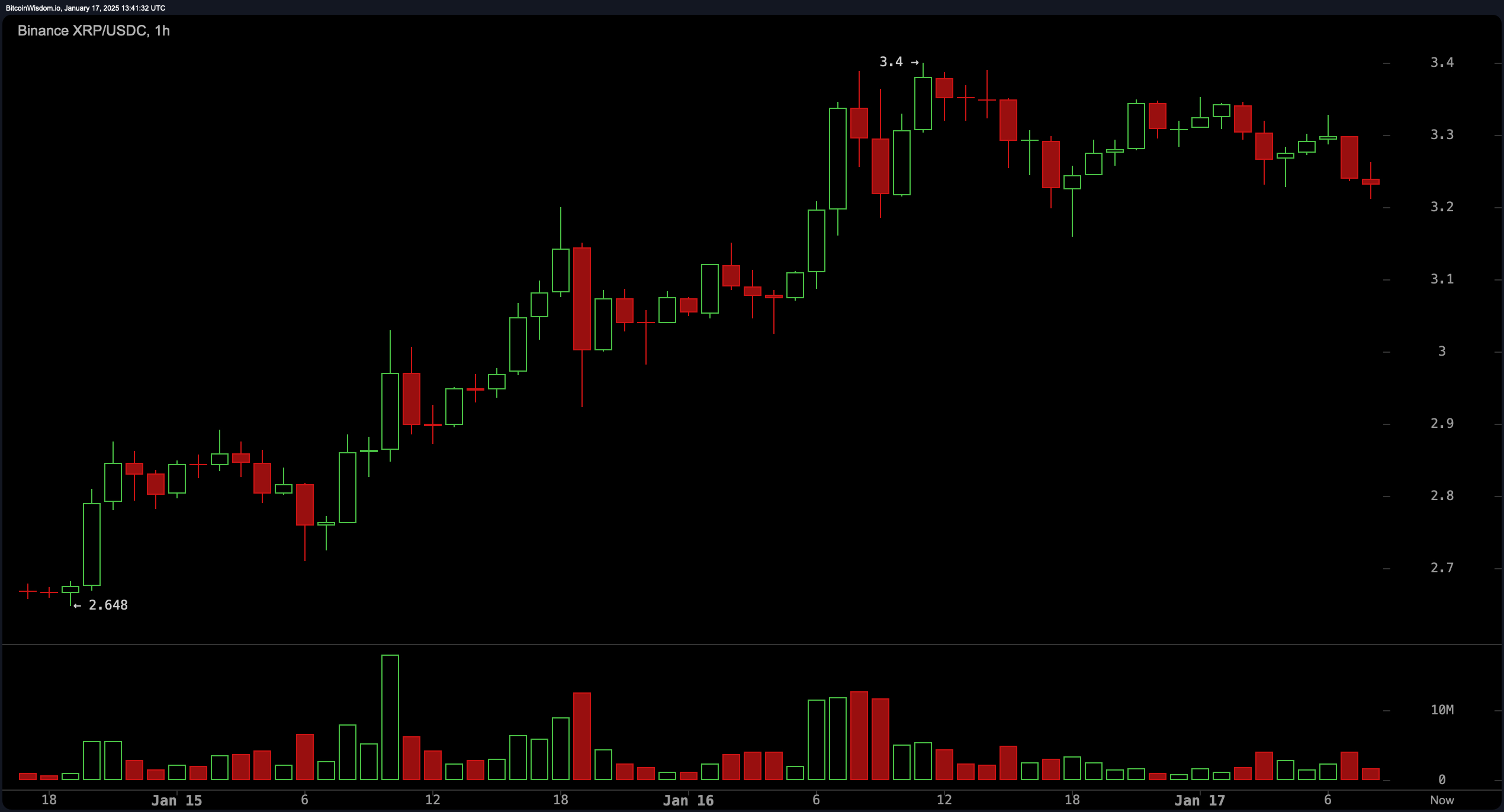Dagscharten forstærker den nuværende bullish bane, med XRP nyligt gennemtrængende kritiske modstandsbarrierer. Det høje på $3,40 understøttes af øget handelsaktivitet, hvilket indikerer en vedvarende købsinteresse. Tilbagetrækninger til $3,00 eller $2,80 kan skabe attraktive muligheder for handlende, der har til hensigt fortsat opadgående bevægelse. Det psykologiske milepæl på $3,50 kan tjene som et afgørende profitmål, især hvis markedets momentum begynder at aftage.