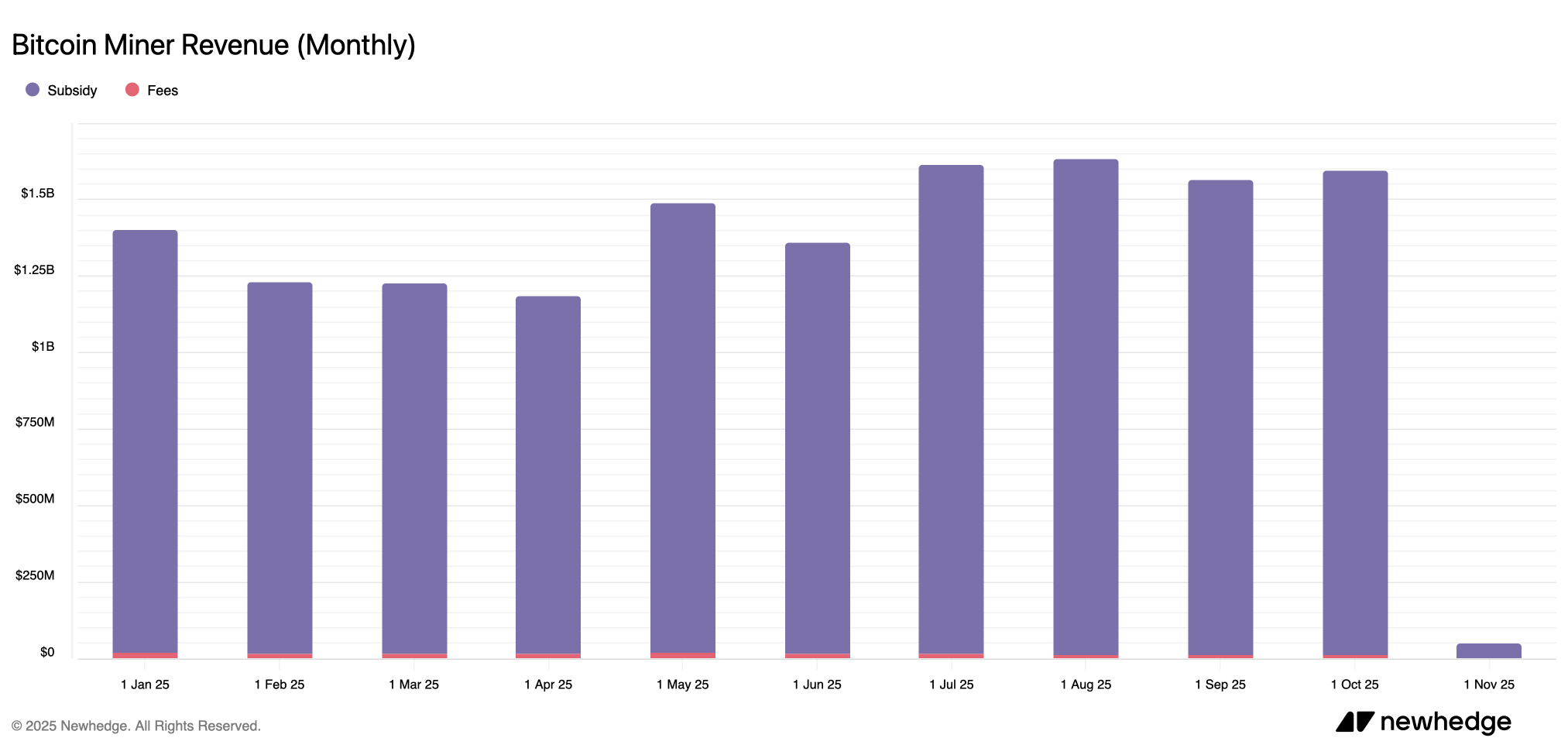 Der Oktober behandelte Bitcoin-Miner etwas freundlicher und erzielte etwa 1,595 Milliarden USD an Einnahmen — davon kamen rund 1,584 Milliarden USD direkt aus dem Blocksubsidium, laut Zahlen von newhedge.io.
