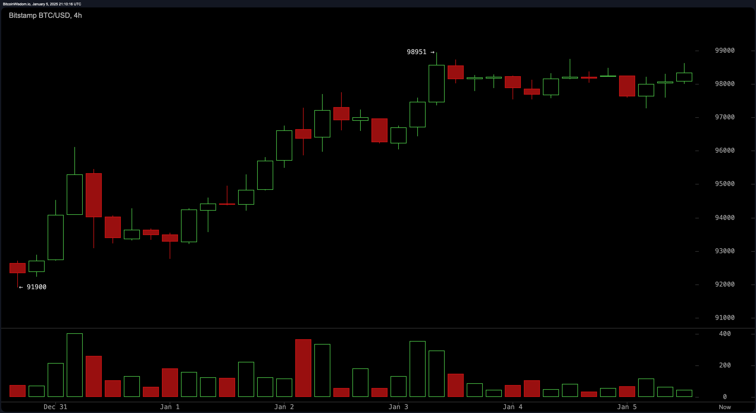 Im 4-Stunden-Zeitraum zeigt bitcoin ein konsistentes Muster höherer Tiefs, was das kurzfristige bullische Sentiment verstärkt. Ein signifikanter Widerstand schwebt bei $98.951, der wiederholt Versuche vereitelt, ihn zu überwinden. Schwankungen im Handelsvolumen erschweren den Ausblick, da eine anhaltende Bewegung über $98.951 den Preis in Richtung $100.000 treiben könnte. Sollte dieser Widerstand hingegen intakt bleiben, ist ein Rückfall in die Unterstützungszone von $96.000–$95.000 weiterhin plausibel.