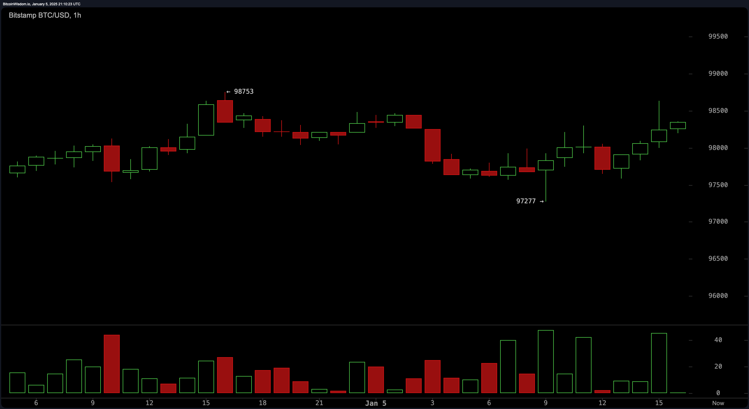 Im 1-Stunden-Chart untersucht bitcoin das Widerstandsniveau von $98.000, nachdem es sich von $97.277 erholt hat. Bullische Kerzen deuten auf Aufwärtsmomentum hin, aber das verringerte Volumen dämpft die Erwartungen an einen entscheidenden Ausbruch. Händler beobachten gespannt, ob dieser Widerstand standhalten wird oder ob er fällt, potenziell in der Nähe von $97.000. Der unmittelbare Trend neigt sich positiv, obwohl eine deutliche Zögerlichkeit den Ansatz zu diesen kritischen Schwellenwerten umgibt.