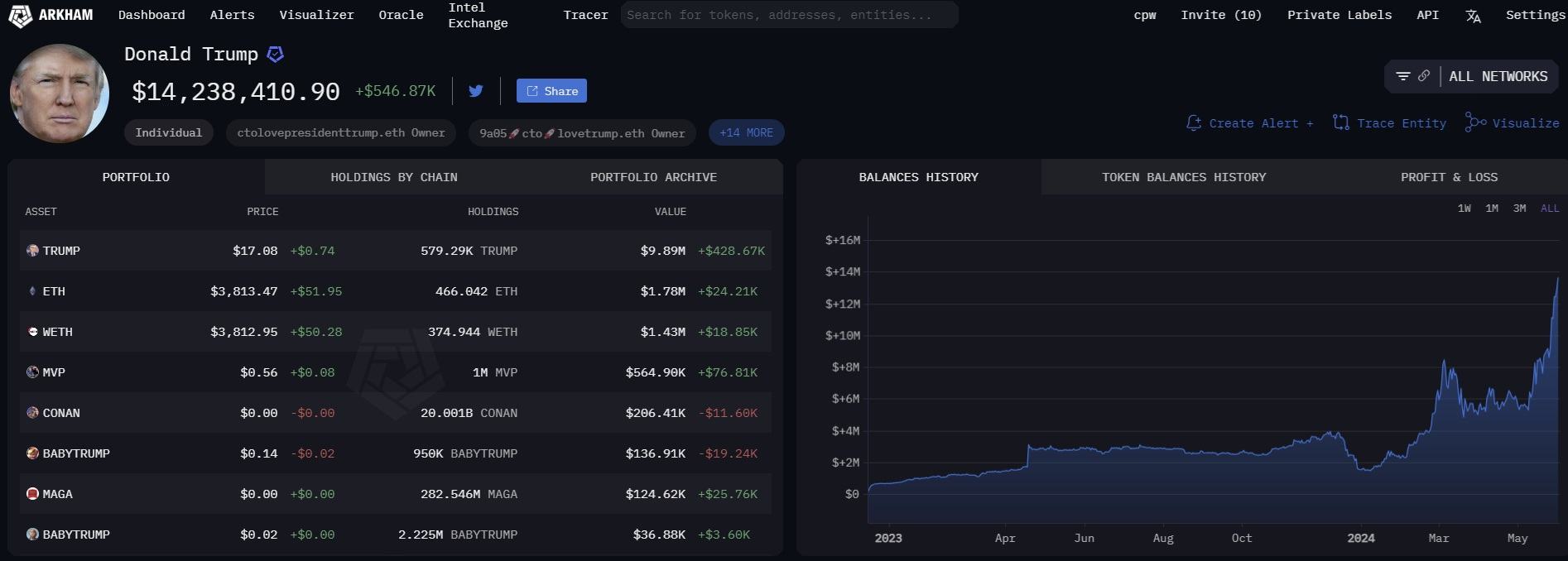 Der ehemalige US-Präsident und Präsidentschaftskandidat Donald Trumps Krypto-Portfolio, verfolgt von Arkham Intelligence, ist gestiegen, nachdem er der Fälschung von Geschäftsunterlagen in 34 Fällen für schuldig befunden wurde, um die Wahl 2016 zu beeinflussen. Zum Zeitpunkt der Verfassung belaufen sich seine Kryptowährungen auf fast 14,2 Millionen Dollar, ein Anstieg von gemeldeten 10,1 Millionen Dollar Anfang dieser Woche.