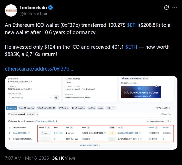 - Lookonchain machte auf die Überweisung aufmerksam, während 2026 eine breitere Reaktivierung früherer Ethereum-ICO-Wallets stattfand.