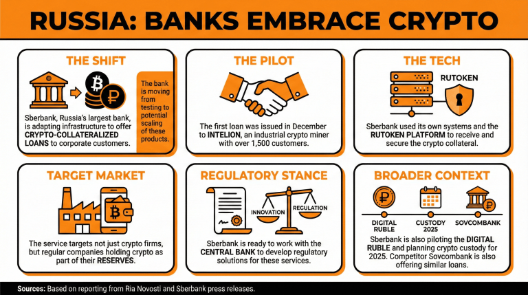 Russische Banken bewegen sich, um digitale Vermögenswerte in das nationale Finanzsystem zu integrieren, wobei die Sberbank den Weg durch die Bereitstellung kryptobesicherter Kredite anführt. -