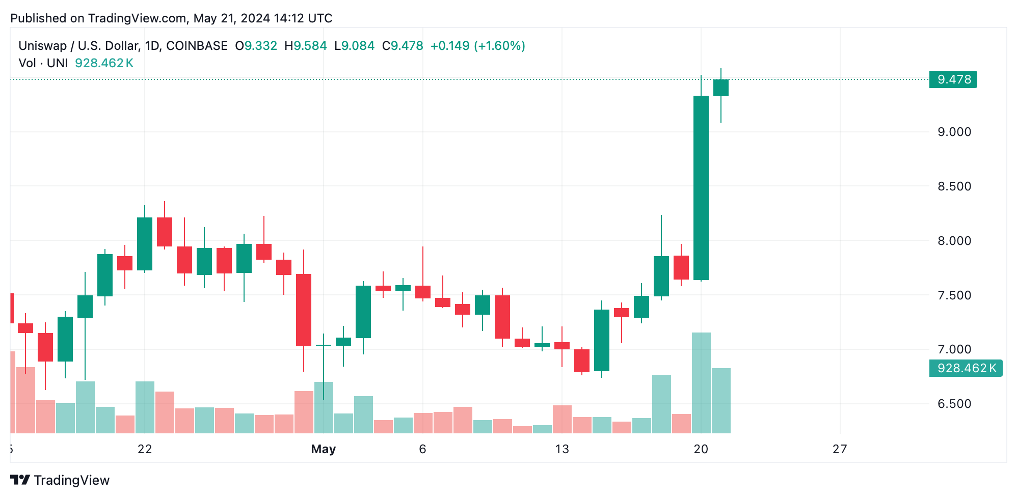 Lido (LDO) war der größte DeFi-Token-Gewinner der letzten 24 Stunden mit einem Anstieg von 36,6%. Es folgte redacted (BTRFLY), das am Dienstag um 31% stieg. Der Coin Bounce (AUCTION) stieg um 28,5%, und Renzo (REZ) verzeichnete einen Anstieg von 28,7% gegenüber dem US-Dollar. Unter den fünf wichtigsten DeFi-Token nach Marktwert führte Uniswap (UNI) mit einem Anstieg von 23,6% im 24-Stunden-Zeitraum.