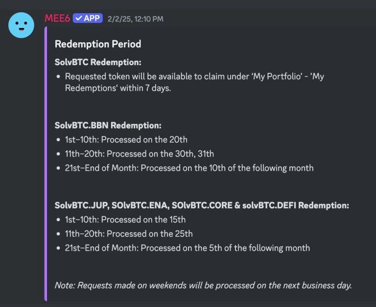 - Bearbeitungszeiten: Einzahlungen und Auszahlungen bei SolvBTC können Wochen dauern. In einer wirklich dezentralisierten, vertrauenslosen Umgebung sollten Transaktionen schnell sein – 24/7-Zugriff ist ein Grundpfeiler der Anziehungskraft von Kryptowährungen. Diese Bearbeitungsverzögerungen werden oft als notwendig für das Risikomanagement erklärt, deuten jedoch in Wirklichkeit auf manuelle Aufsicht oder zentralisierten Handel von Vermögenswerten im Hintergrund hin.