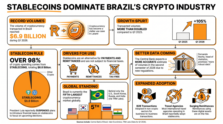- Die brasilianische Zentralbank meldete für das erste Quartal 2026 ein Kryptowährungsvolumen von 6,9 Mrd. US-Dollar, wobei Stablecoins 98 % der Transaktionen ausmachten.