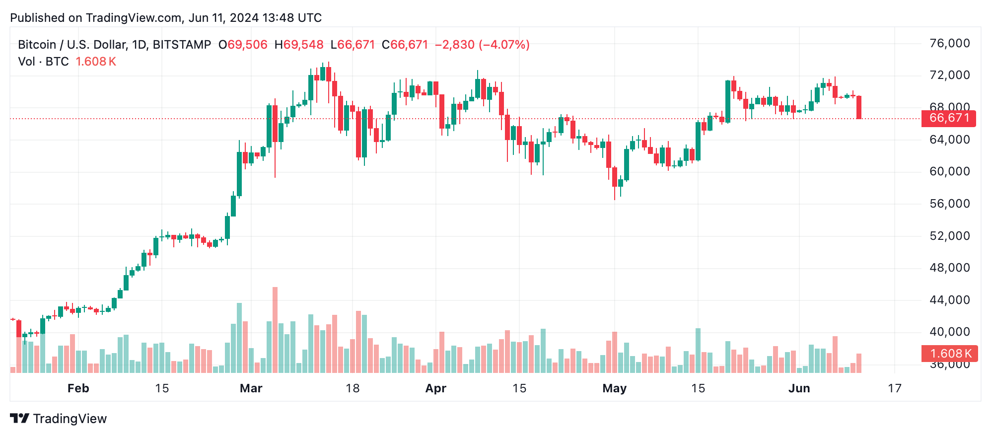 El martes, el precio de bitcoin (BTC) cayó a un mínimo intradía de $66,696 por unidad, marcando una disminución del 3.3% en las últimas 24 horas. Esta caída resultó en la liquidación de $170.25 millones en posiciones largas de derivados, con $50.87 millones de este monto compuesto por posiciones largas de BTC.