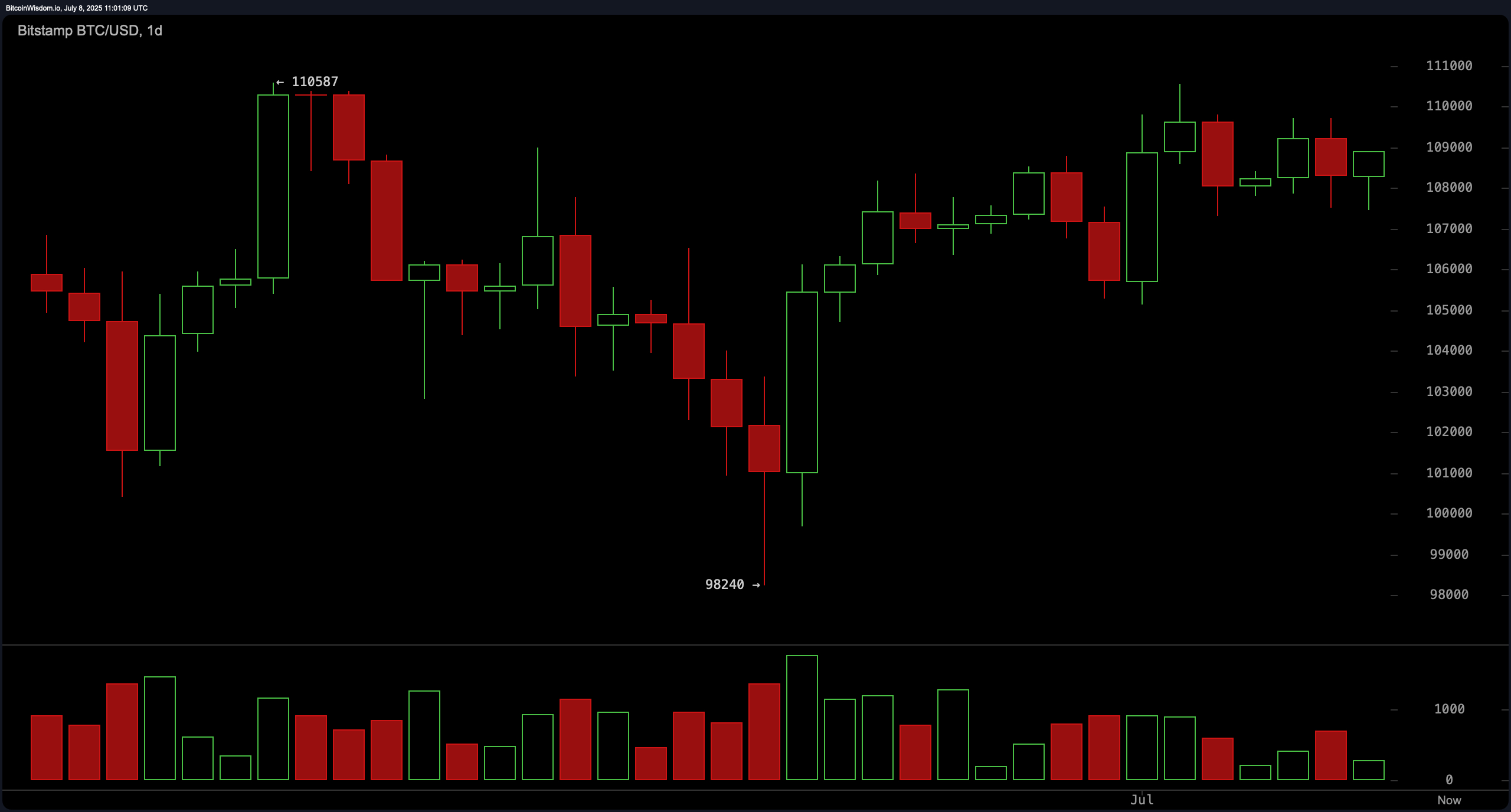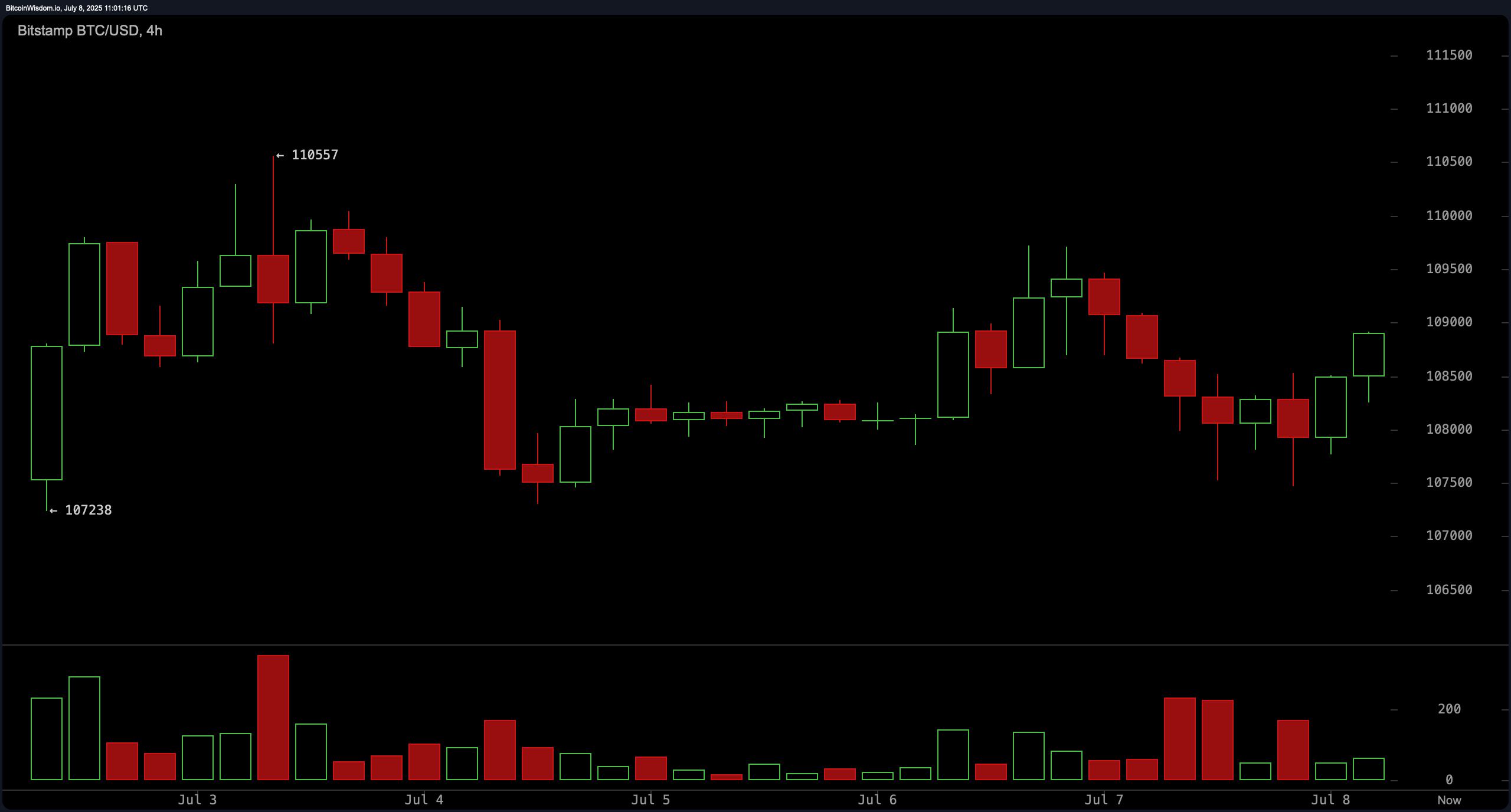 En el gráfico de 4 horas, bitcoin parece estar consolidándose con una ligera inclinación alcista. El precio está oscilando entre el soporte en $107,238 y la resistencia en $110,557. Las formaciones de velas del 5 al 7 de julio mostraron indecisión en el mercado, pero el reciente intento de romper señala un sesgo subyacente alcista. Una nueva prueba de $108,000 con volumen robusto validaría una posición larga de rango medio, mientras que los niveles de salida se identifican entre $109,800 y $110,500 si el impulso disminuye.