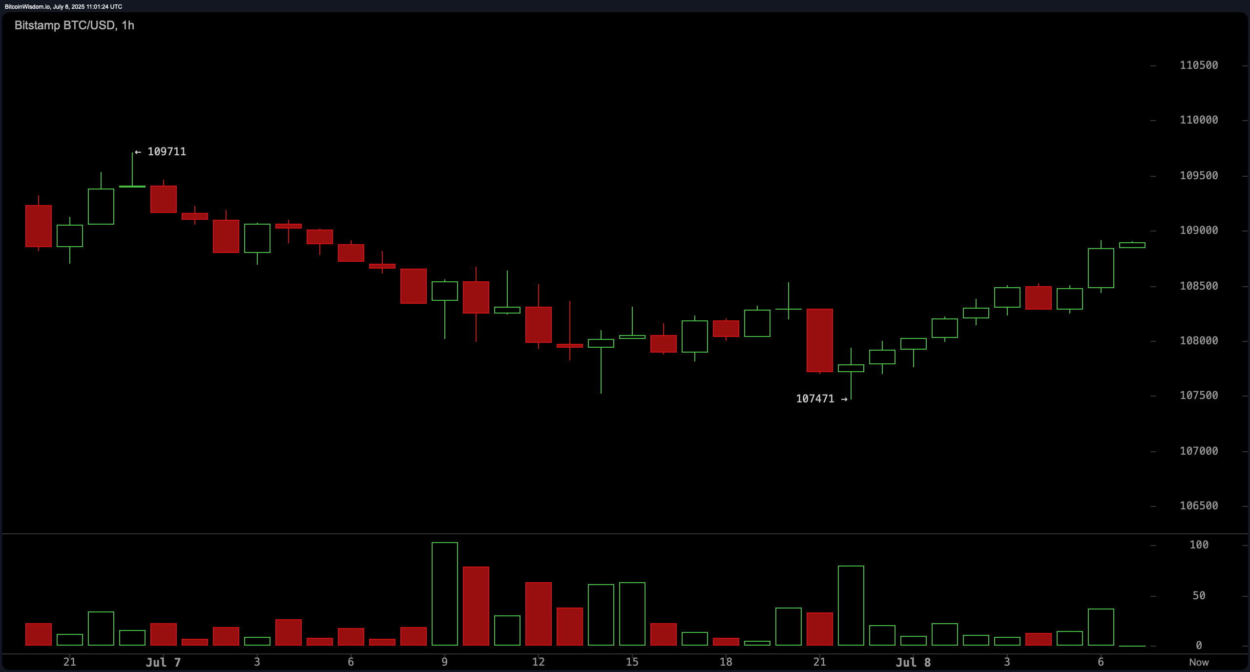 El precio de Bitcoin se mueve hoy entre $108,832 y $109,067, marcando una continua fortaleza en su tendencia de recuperación en curso. Con una capitalización de mercado de $2.16 billones y un volumen de negociación en 24 horas de $23.73 mil millones, bitcoin fluctuó dentro de un rango intradía estrecho de $107,591 a $109,067.