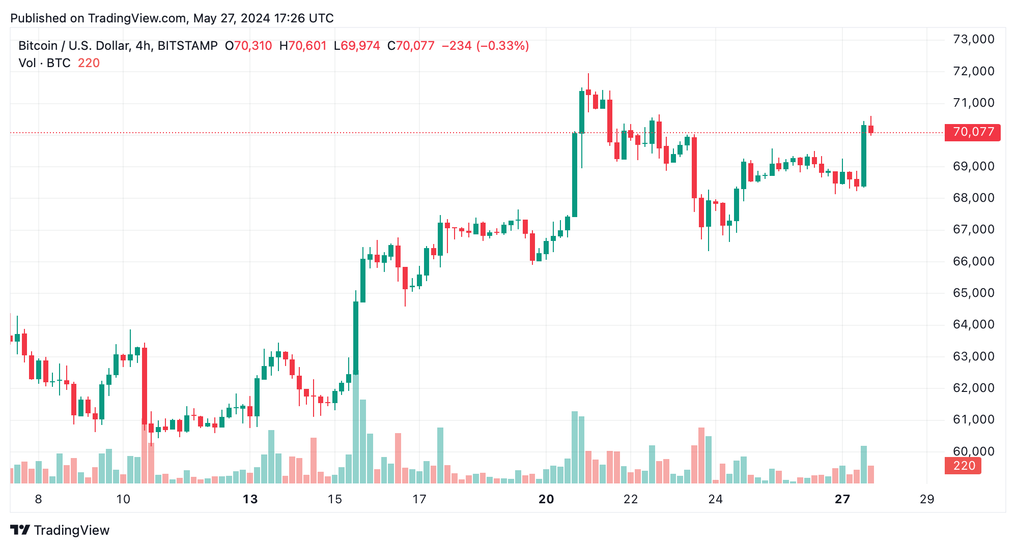 El precio de bitcoin ha superado los $70,000, aumentando un 2.1% durante las sesiones de negociación de hoy. Este último aumento llevó a la liquidación de $27.75 millones en posiciones cortas de bitcoin.