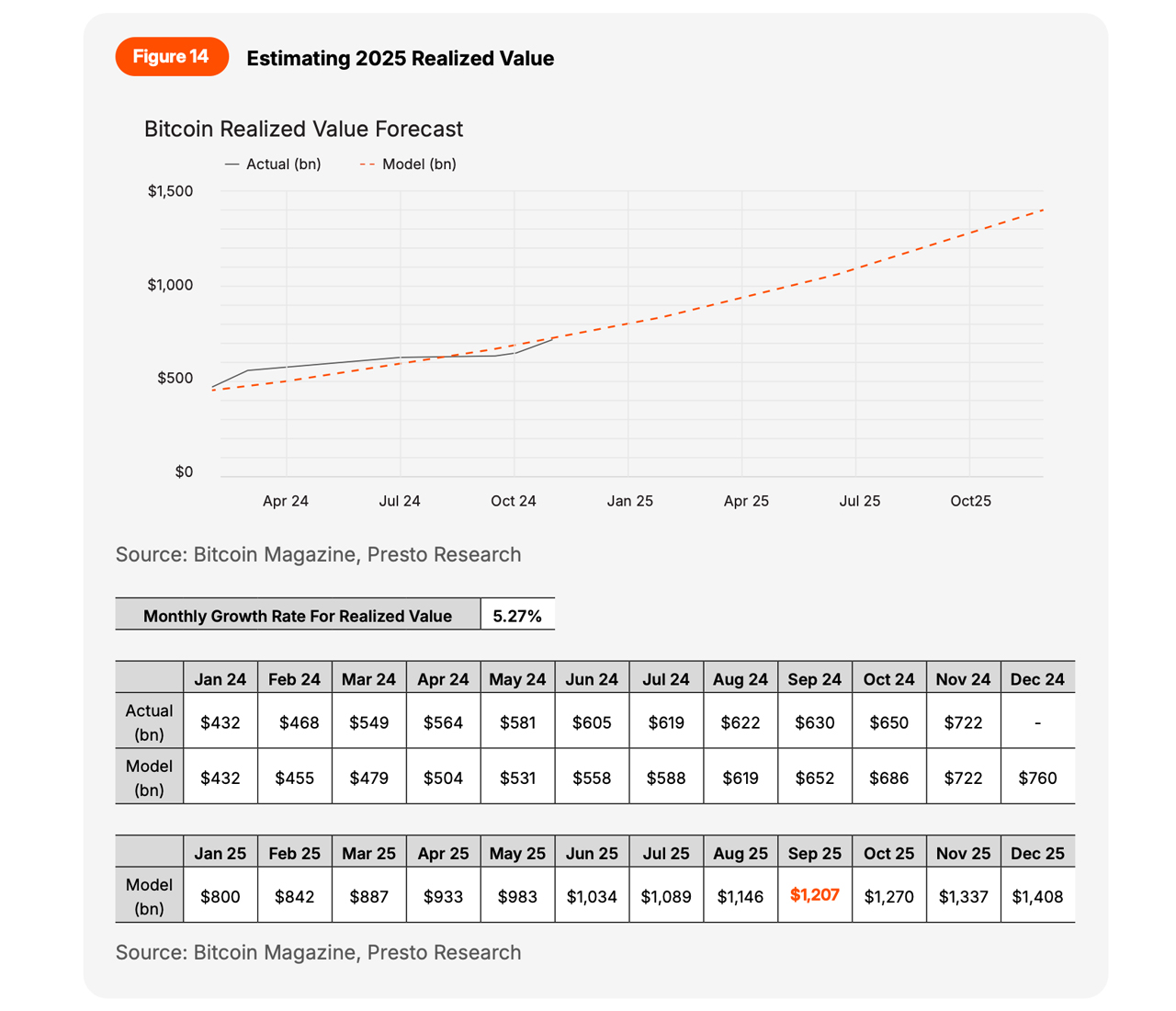“El enfoque de manera más conservadora aplicando un múltiplo de 3.5x al pronóstico de RV de $1.2 billones para el tercer trimestre de 2025, asumiendo un crecimiento mensual compuesto del 5.3% desde el RV actual de $722 mil millones,” señala el analista de Presto Research en el estudio. “El 5.3% es la tasa de crecimiento mensual compuesta de RV entre enero y noviembre de este año, que captura el impacto de un acceso institucional más fácil habilitado por los ETFs al contado (los ETFs al contado adquiriendo más BTC resultarán en un aumento de RV).”