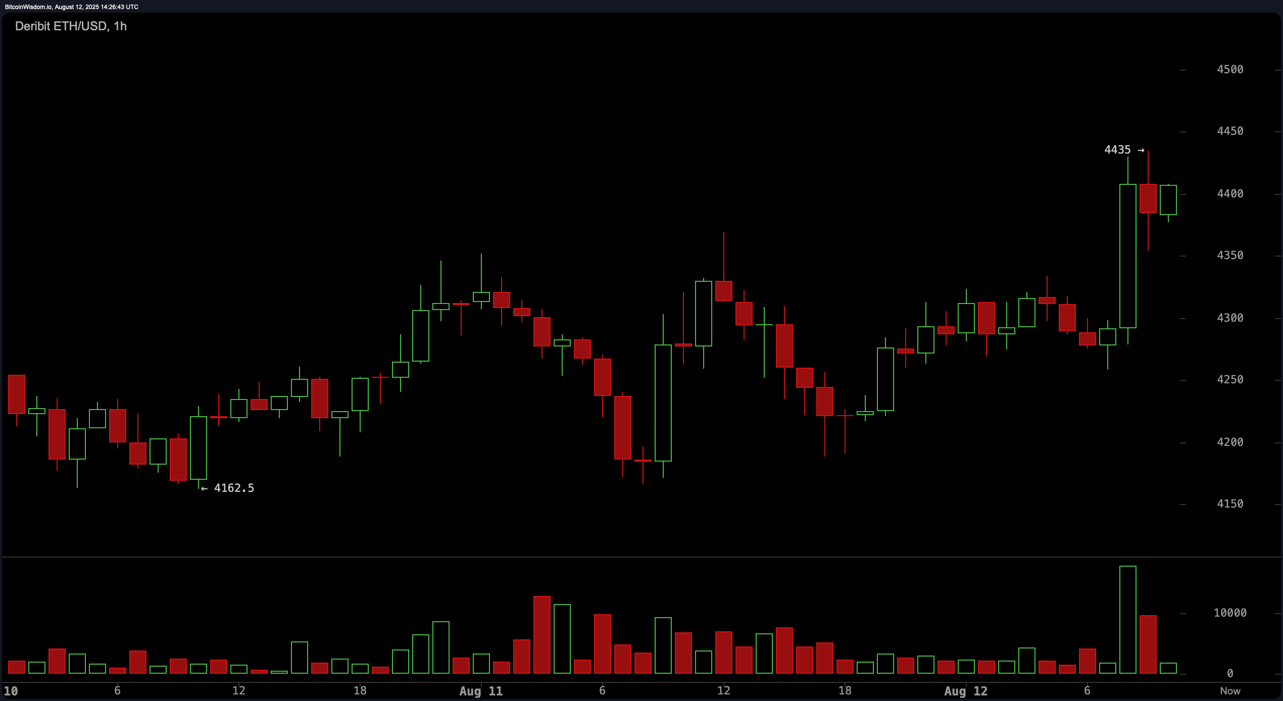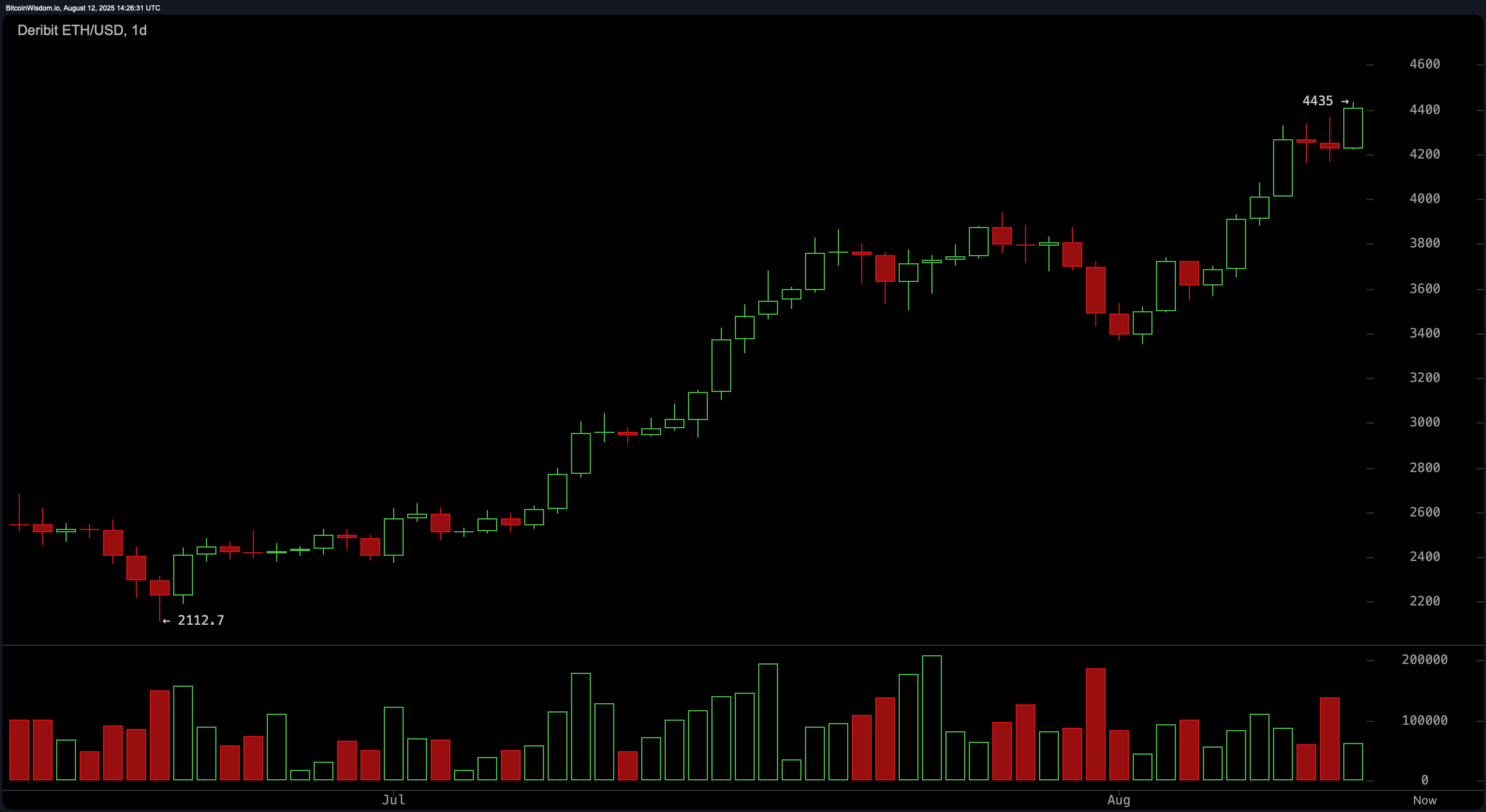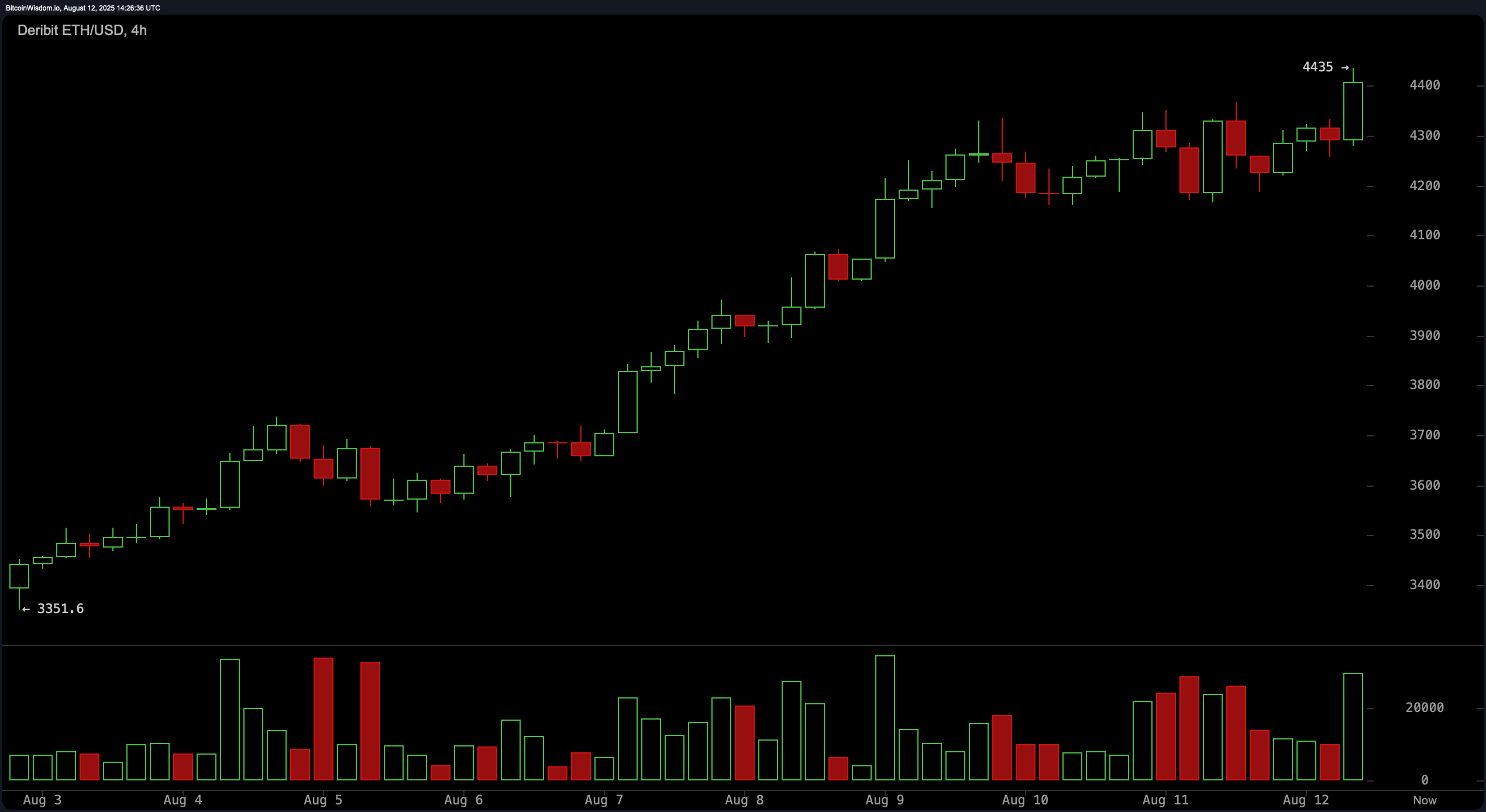 El precio de Ethereum se sitúa en $4,403 el 12 de agosto de 2025, a las 10:45 a.m. hora del Este, respaldado por una capitalización de mercado de $530.27 mil millones y un volumen de comercio de 24 horas de $43.98 mil millones. El rango intradía del día abarcó desde $4,196 hasta $4,435, subrayando una mayor volatilidad a medida que los operadores pusieron a prueba niveles de resistencia clave.