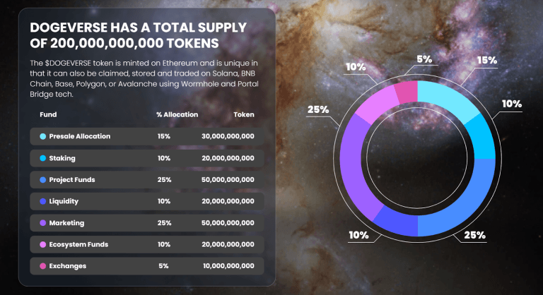 Se espera que las recompensas por staking de Dogeverse continúen mucho en el futuro. El proyecto ha asignado el 10% de su suministro total de tokens, o 20 mil millones de tokens, para pagar recompensas a los inversores leales de $DOGEVERSE.