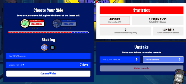 El ecosistema también tiene otras características, como debates semanales. Estos son eventos comunitarios donde los usuarios pueden enfrentarse en una batalla de palabras, presentando argumentos políticos convincentes, con el ganador obteniendo $DUM.