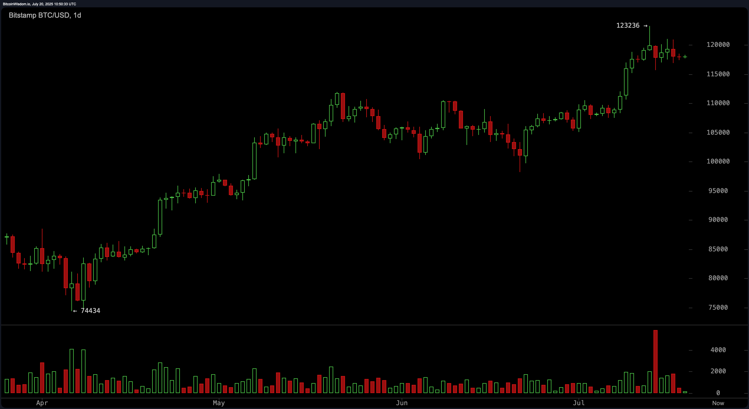 El gráfico diario BTC/USD destaca una fuerte tendencia alcista a largo plazo desde abril, aunque las velas recientes revelan un pico de volumen rojo, insinuando un comportamiento de toma de ganancias. Con bitcoin consolidándose justo por debajo de $120,000, este nivel ahora sirve como pivot crítico para la continuación de la tendencia. El soporte se mantiene sólido entre $116,000 y $117,000, presentando una oportunidad táctica de reingreso. Sin embargo, una ruptura sostenida por debajo de $114,000 podría cambiar la perspectiva más amplia, con posibles objetivos de retroceso hacia $108,000–$110,000.
