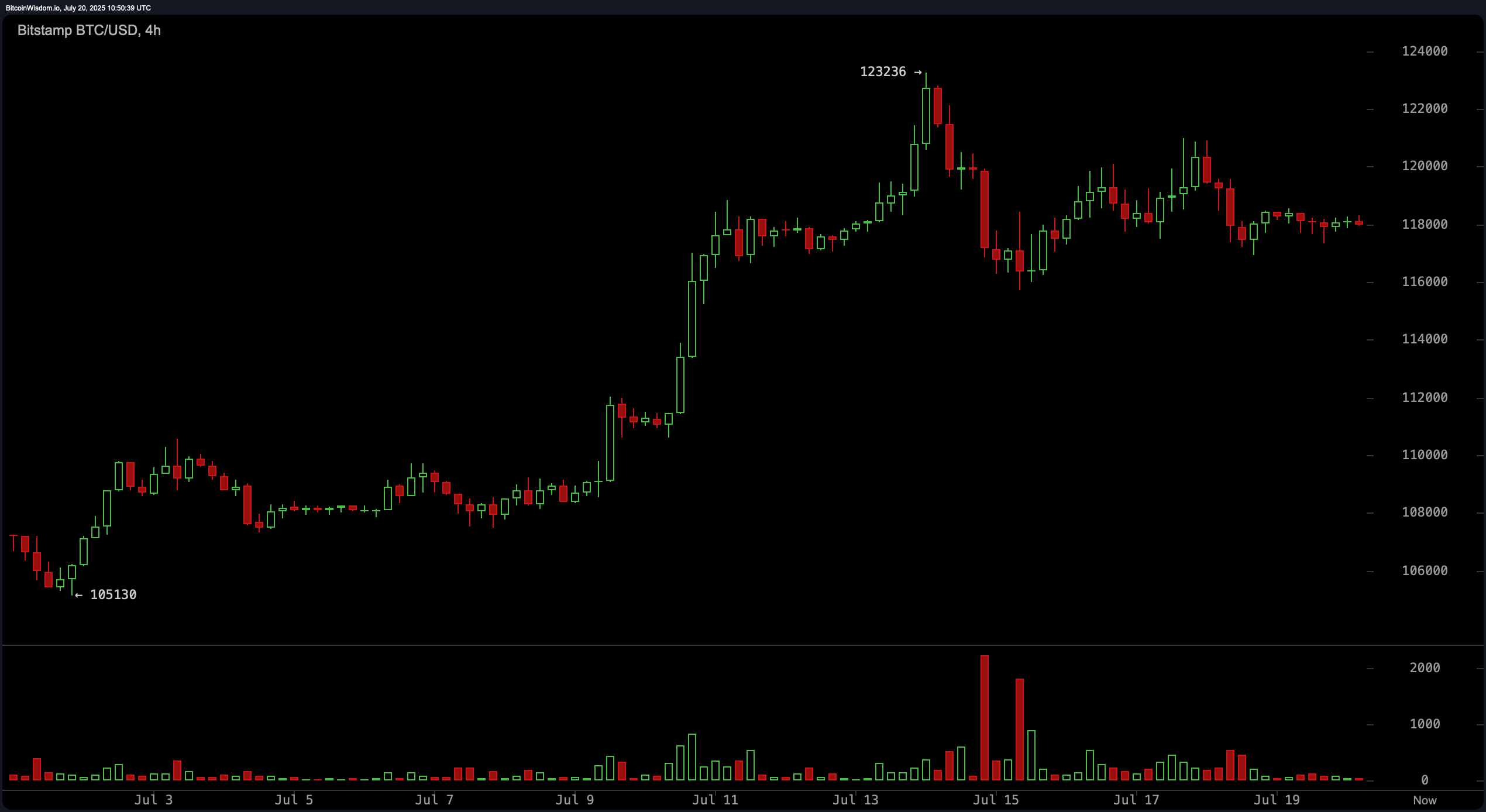 Ampliando al gráfico de 4 horas, bitcoin ha pasado de una retracción post-pico desde $123,236 a una fase de consolidación descendente, marcada por máximos más bajos y disminución de volumen, una indicación de fatiga del comprador o indecisión del mercado. Aunque las medias móviles exponenciales (EMAs) a intervalos de corto a medio plazo como 10, 20 y 30 señalan alcista, la acción del precio sigue limitada por debajo de la resistencia de $120,000. Una ruptura al alza por encima de $120,500 con volumen significativo reforzaría un sesgo alcista, mientras que el fracaso en mantener el soporte de $117,000 podría exponer el precio a una caída hacia la zona de $114,000–$111,000.