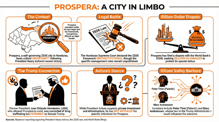 Prospera, Hondurases asuv Töö ja Majandusarengu Tsoon (ZEDE), mis kasutab bitcoini seadusliku maksevahendina, seisab silmitsi ebakindlusega oma tuleviku suhtes pärast seda, kui kõrgeim kohus kuulutas selle loomise aluseks oleva raamistiku põhiseadusevastaseks.