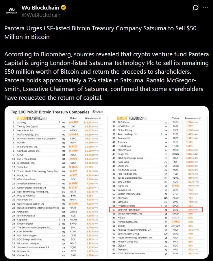 ساتسوما تکنولوژی که در بورس لندن معامله میشود، در سال ۲۰۲۵ در یک دور یادداشت قابلتبدیلِ بیشازحد پذیرهنویسیشده ۲۱۸ میلیون دلار جذب کرد؛ پنتره کپیتال نیز در کنار ParaFi، کراکن و DCG از حامیان کلیدی آن بود. بخشی از این دور با بیتکوین تسویه شد و پذیرهنویسان بهجای پول نقد، بیش از ۱۲۵ میلیون دلار به صورت BTC پذیرفتند. اکنون گفته میشود همان سرمایهگذار شرکت را تحت فشار گذاشته تا مسیر را معکوس کند و کل موقعیت بیتکوینی خود را بهطور کامل نقد کند.