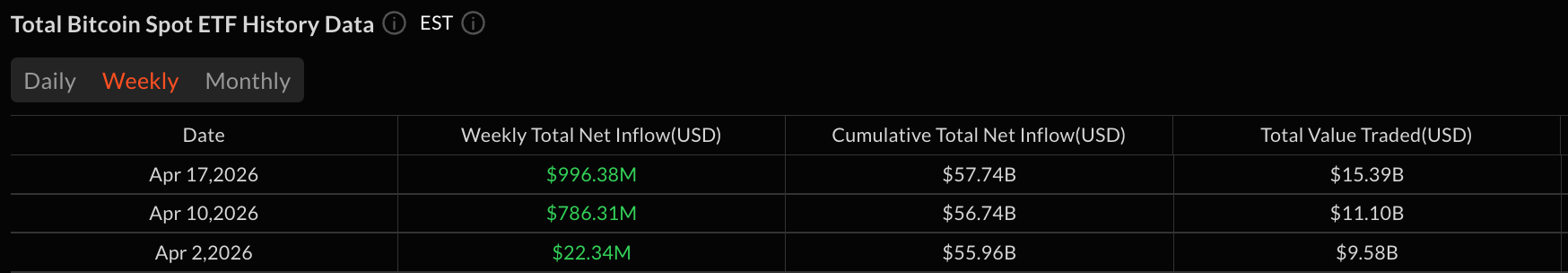 - Bitcoin-ETF:t keräsivät 996,38 miljoonaa dollaria 13.–17. huhtikuuta, ja kärjessä oli Blackrockin IBIT 906,1 miljoonan dollarin sisäänvirtauksilla.