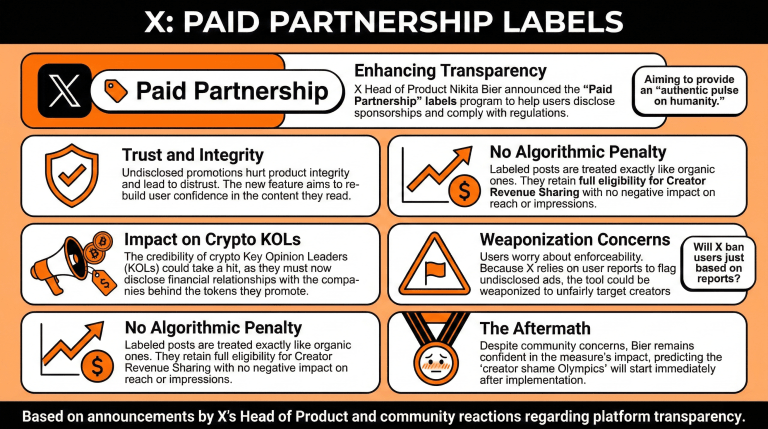 Sunnuntaina X:n tuotejohtaja Nikita Bier paljasti, että yhtiö ottaa käyttöön maksetun yhteistyön merkintäohjelman (Paid Partnership labels program), jonka avulla käyttäjät voivat ilmoittaa yhteytensä mahdollisiin kumppaneihin, jotka sponsoroivat heidän julkaisujaan.