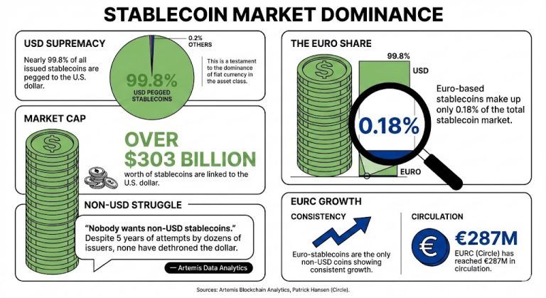 Europerusteiset vakavaluutat saavuttivat vain 0,18 % vakaavaluuttamarkkinasta, mikä on marginaalinen luku verrattuna dollarin vakavaluuttojen osuuteen. Tästä huolimatta Circlen Patrick Hansen korosti, että tämä luku oli kasvamassa.