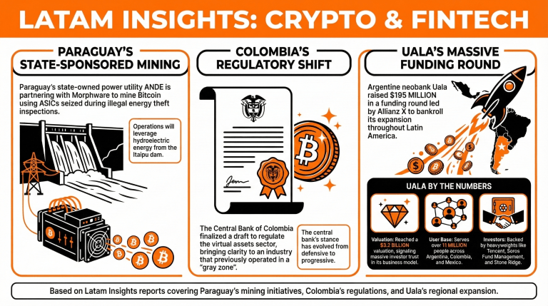 Tervetuloa Latam Insightsiin, kokoelmaan viime viikon tärkeimmistä Latinalaisen Amerikan kryptouutisista. Tässä numerossa Paraguay pyrkii ottamaan käyttöön takavarikoitua laitteistoa bitcoinin louhintaan, Kolumbia valmistelee kryptoteollisuuden sääntelyä ja Uala kerää 195 miljoonaa dollaria laajentuakseen koko Latinalaiseen Amerikkaan.